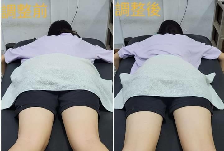 案例一|左:調整前可見骨盆歪斜、右腿外旋較明顯;右:調整後骨盆回正、下肢放鬆度對稱。