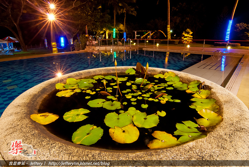 雖然泳池內空無一人, 但在週圍燈光的照射下, 景色與氣氛都令人感到舒服, 一旁種植的蓮花雖尚未開花, 但也是別有一番風味, (如上圖)。