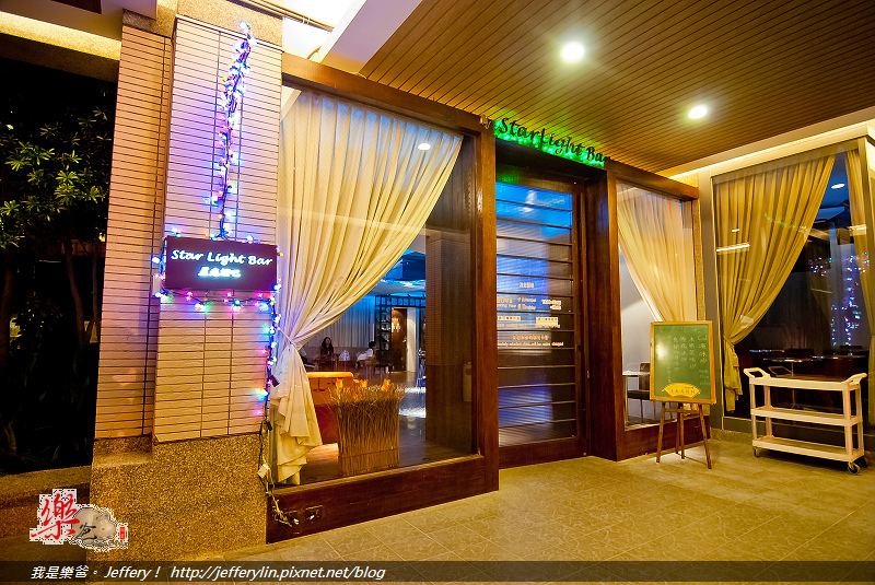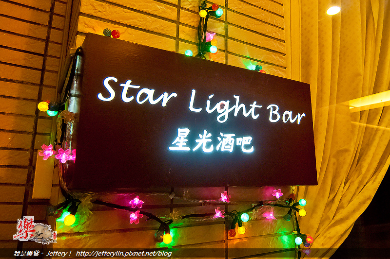 夜幕低垂, 位在游泳池旁的"星光酒吧"霓虹燈也亮了起來, (如上圖)。
