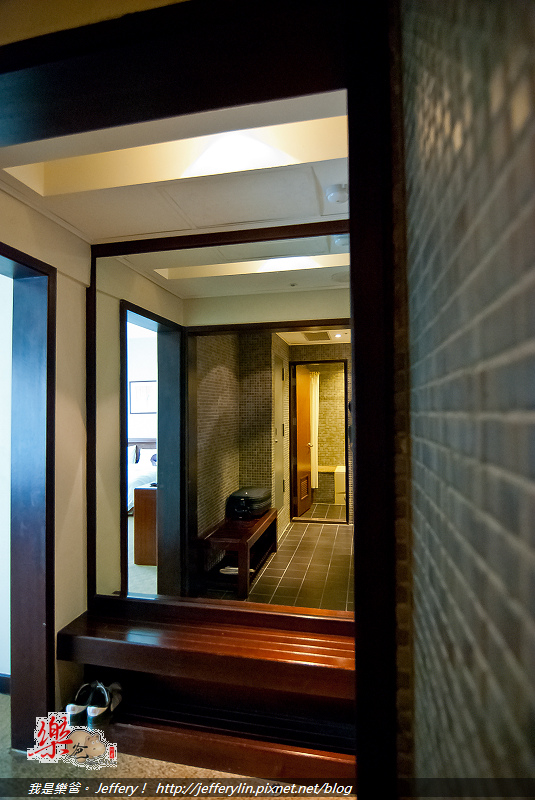 其實一進到房間, 除了一旁是浴廁外, 相反的一邊則是設置了一面超大鏡子牆與一排座椅, 如此可能可以增加一些空間感與設計感吧? (如上圖)。