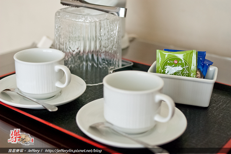 房間內也提供了礦泉水、茶包、即溶式咖啡、快煮壺以及相關餐具組, (如上圖)。