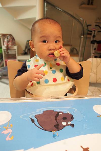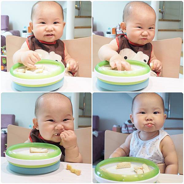 學吃飯一開始是先讓他習慣自己用手把東西送進嘴裡, 所以先從好抓取的吐司, 麵包, 饅頭, 水果類開始嘗試