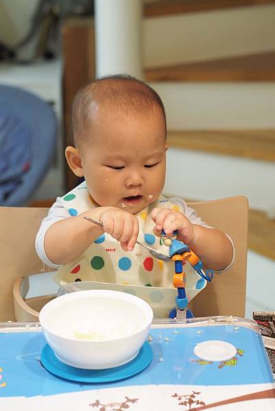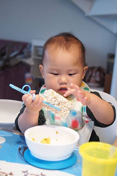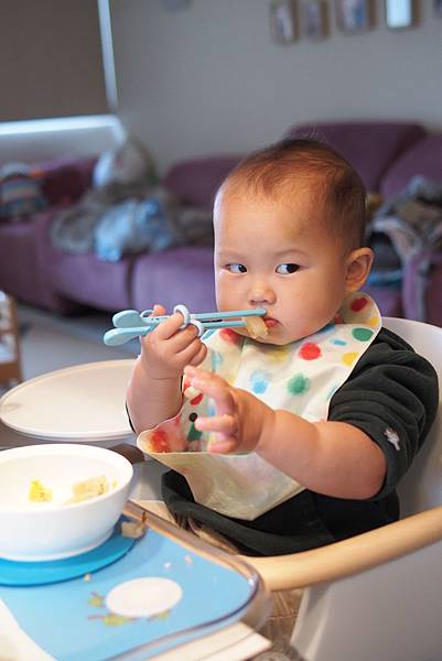 學習湯匙我選的是WMF的, 匙面會向左邊彎, 小人的手控制方向還不是很好, 所以用這種湯匙比較容易把飯放進嘴裡, 不過這個時期的小人都是左右手並用, 沒有很固定用那一隻手, 所以換到左手時好像比較那麼不順, 不過只要他肯吃還是可以吃的到食物就是了.