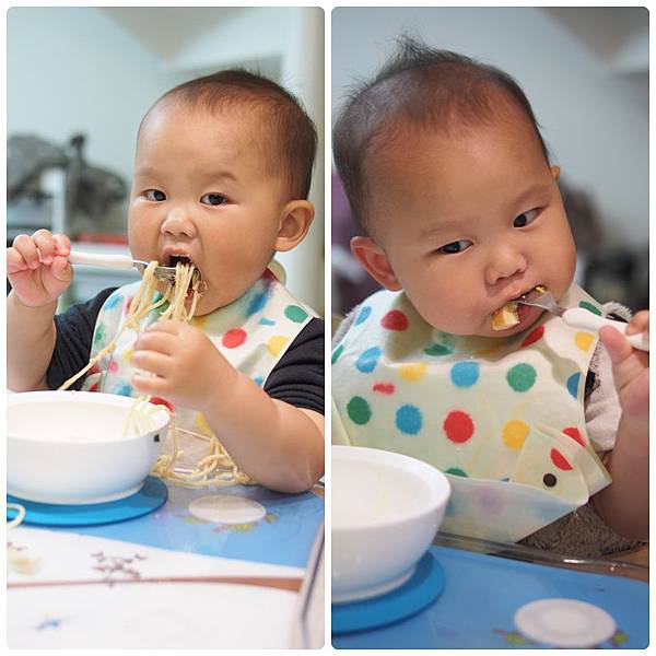 大約在1Y7, 8M 左右, 少晞開始很喜歡搶我們手上的筷子, 一直說他要用筷子, 不要用湯匙了, 所以在1Y9M 時, 拿出了 Edison 的學習筷給他嘗試看看, 一開始時他還不太會把手指放進學習筷上洞裡, 幫他把手指就定位後, 本來以為他手指頭還太短, 所以沒辦法自行把筷子打開, 當我幫忙筷子打開後, 他就能自己夾到食物送到嘴巴裡了. 隔天再用筷子只需要把他的手就定位, 就自己可以夾到麵和菜了, 還一副超得意的樣子 XD