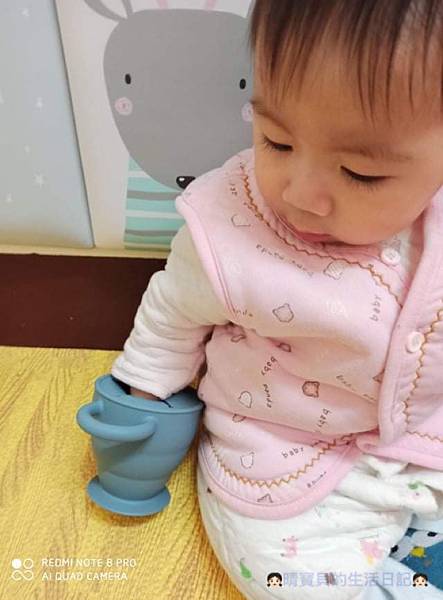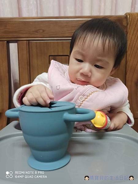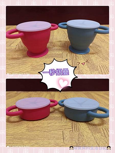 相信許多媽咪都有過買零食杯的經驗,寶貝們牙癢癢時期最棒的零食就是米餅了,但因程程狀況比較特殊,他一次只有辦法吃一小口,正巧看到一款好用又可以摺疊的零食杯,不但可以讓寶貝裝零食又有耳可以訓練抓握能力,且材質部分也達到晴媽所期望的是食品級矽膠,不含BPA,最重要的是它可以用蒸氣消毒鍋消毒耶(晴媽使用的是小白熊智效奶瓶消毒烘乾鍋),真的很方便啊。