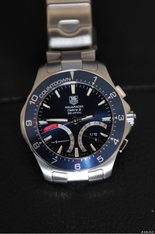 小弟覺得豪雅的照片藍色都偏淡...附上小弟之前剛入手的Aquaracer Regatta版... 雖然說是去年的樣式,不過價錢太好... 不入手對不起自己... 實品的藍色真的很漂亮,是屬於深寶藍色那種~Chrono Mode正常時間顯示