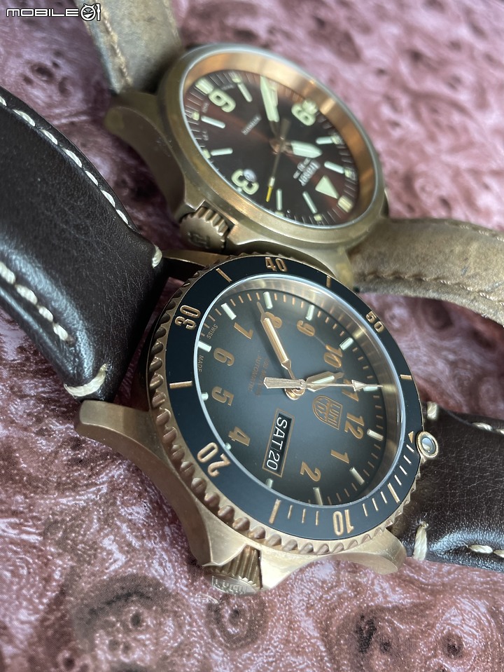 dallasoriginal wrote:對於只愛金光閃閃的不...(恕刪) 銅錶不管鏽蝕多嚴重,都是會戴出門啊!銅錶就是要玩這種歷時、滄桑的感覺,而且每個銅錶氧化都是獨一無二哦!戴銅錶出去絕對不會撞錶啦!我自己是常用硫磺、白醋、濃鹽水...等加速氧化,有時還混合使用,看能不能做出喜歡的感覺。如果覺得氧化出來的效果不喜歡,就再用可樂、白醋、牙膏...還原。就算同樣都用硫磺泡,泡出來的氧化效果也都不同。龍頭的部分要看鏽蝕的程度,一般都還是打得開啦,因為銅鏽都只是薄薄一層,且會形成保護層,不會再繼續鏽進去了。至於打開會不會讓水氣跑進去?那當然是會啊,平常你開龍頭的時候肯定會有水氣跑進去啊,跟是否生鏽無關。我這支錶的錶圈應該是被銅鏽蝕住了,轉不動...應該是鹽水跑進去旋轉錶圈裏面這張圖是剛泡完醋,全還原的樣子,整個錶都有一股醋酸味...這張照片是剛泡完硫磺液,整個錶硫化、黑化,這個氧化相對於氯化銅、醋酸銅來說比較強,黑色附著力強,雖然用毛巾可以把八成的黑色擦掉、剝落,但還會剩下兩成黑色留在上面,做舊的效果非常明顯。其實也不用特別擦,戴在手上,附著力不夠的部分就會慢慢掉下來了。下圖是某次我很滿意的效果,用硫氧化後錶圈變黑,但刻度經擦拭後變白變亮,意外做出像968陶瓷圈的效果,很有趣。