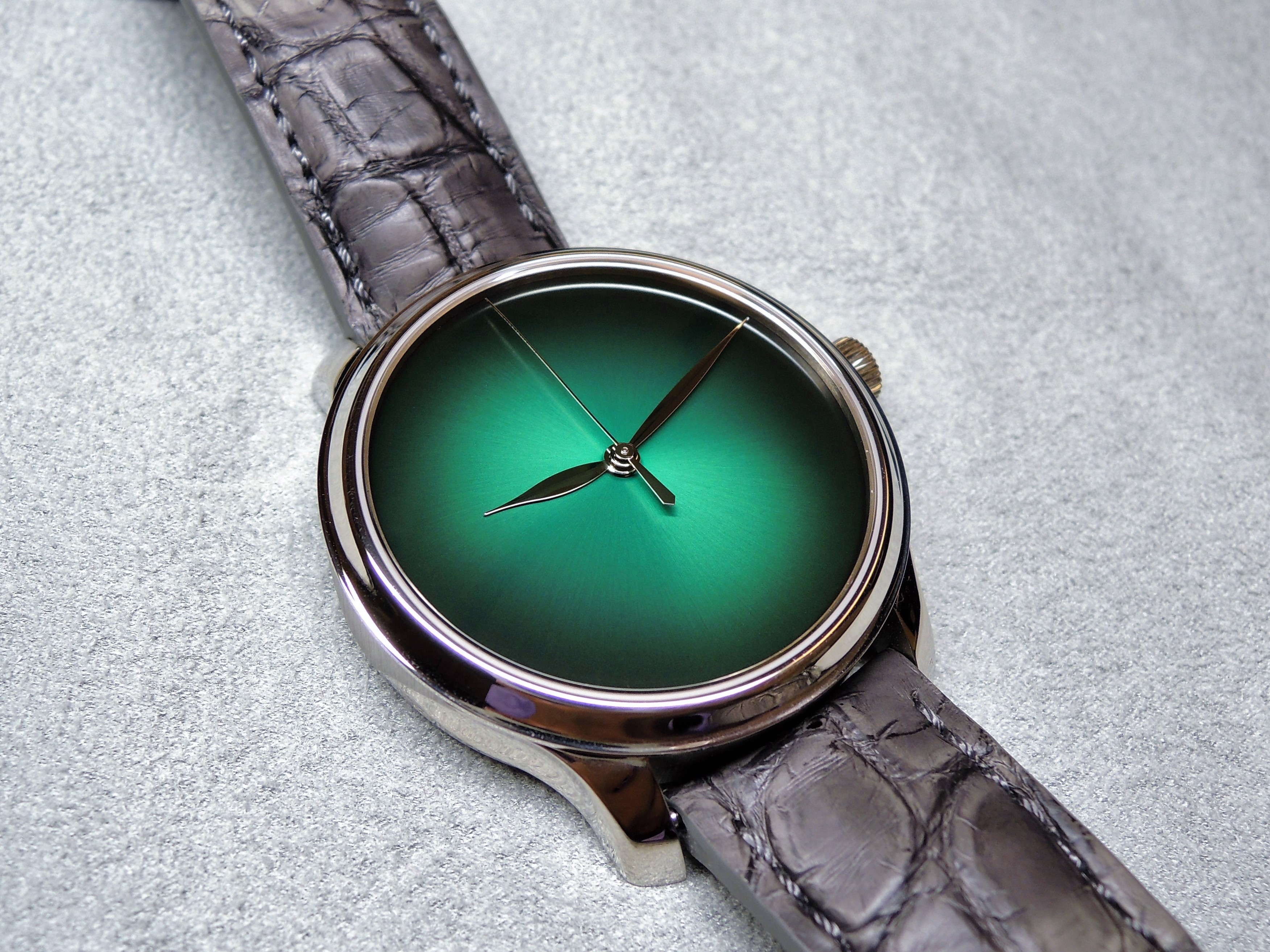 整體質感相當好,喜歡它的柳葉針與微凸風防,跳秒小秒針與計時掃秒很有特色,牛皮錶帶也柔軟貼手。煙燻綠面盤十分耐看,雖然跟亨利慕時的清澈通明的宇宙綠仍有差距,但考慮到相差一百倍的價格沒話說啦!而會讓玩家們猶豫的,應該就是石英機芯與礦物玻璃風防這兩個因素了吧!