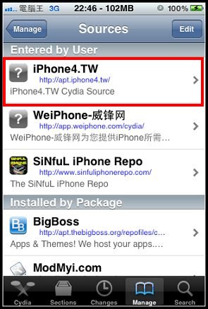 ▲首先加入Source可用「http://apt.iphone4.tw」或「http://repo.benm.at」(如果您不會加Source,請點我),加入Source後進入iPhone4.tw或benm.at。