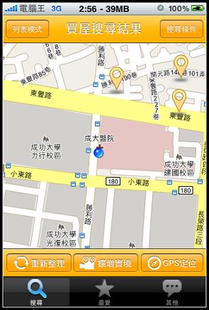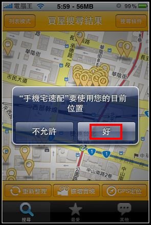 一開始執行時軟體會要求使用你現在所在地的位置,以方便搜尋在地資料,進去後軟體會以你現在所在地顯示周邊房屋物件: