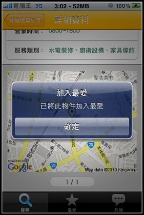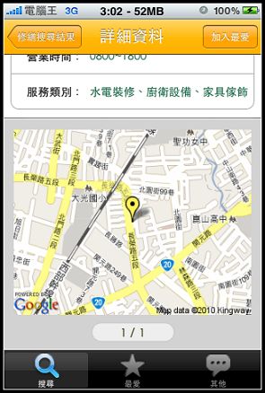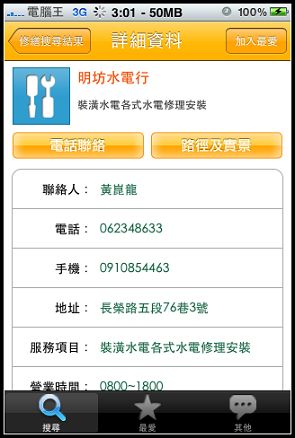 點選店家後就會有詳細的聯絡資訊可以查詢並通知師傅過來維修: