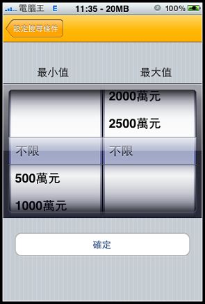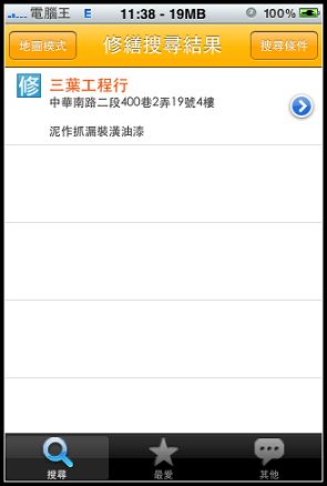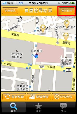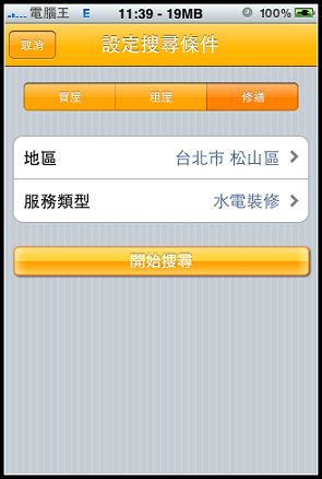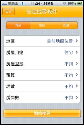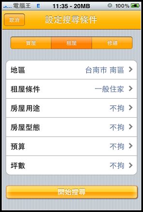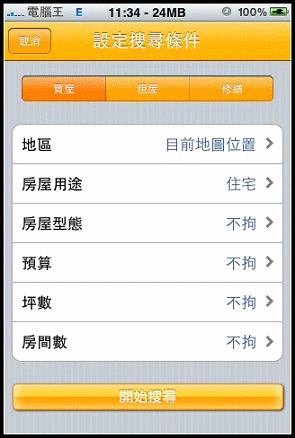 接下來點選主選單右上角的"搜尋條件"就可以依照買屋、租屋與修繕等資料作搜尋:
