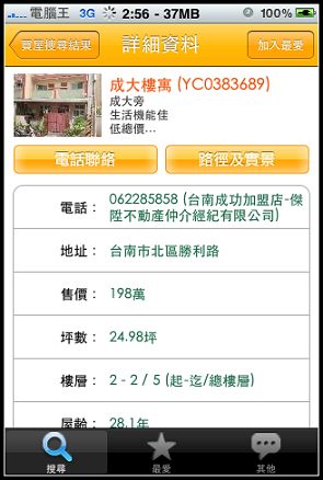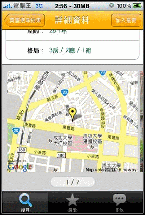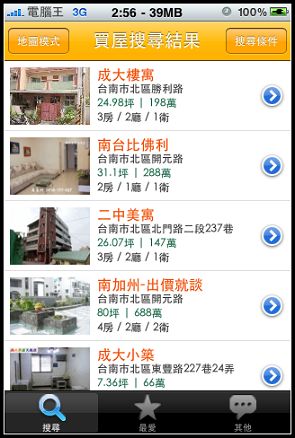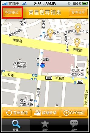 筆者把所有功能簡單的介紹一下,進入軟體後預設的模式是"地圖模式",點選左上角可以改成比較清楚的列表模式(因為地圖模式有顯示範圍的限制),除了小圖片以外還有坪數、價位、房間衛浴數等簡單資料: