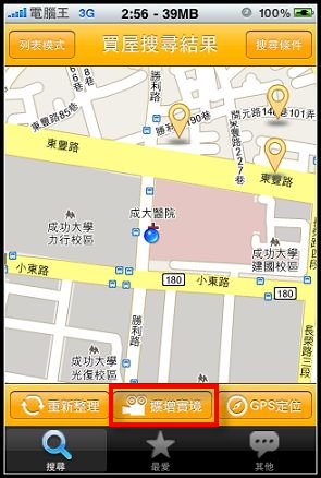 除了地圖模式與列表模式以外更可以使用擴充實境(AR)功能,在實際畫面上就會有周邊房屋的概略方向與資訊: