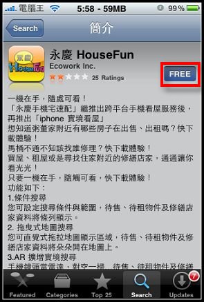 永慶房屋在行銷方面總是讓人印象深刻,而他的iPhone App也延伸了這個概念,除了一般房仲注重的房屋租售服務以外還多了修繕服務的查詢內容,首先去APP STORE搜尋"永慶",就可以找到"永慶 HouseFun":
