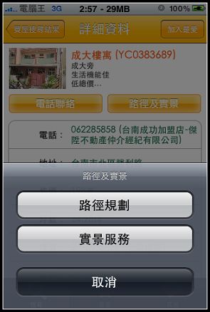 點房屋資訊後就會有詳細的資訊,上半段的電話聯絡可以使用者直接使用撥打電話跟房仲聯絡,而下半段就有地圖可以查詢,而且還可以左右滑動切換其他照片: