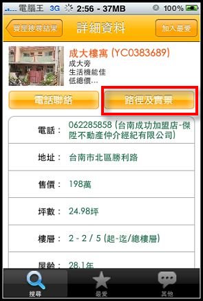 下半段的資訊裡面有地圖、房屋外觀、藍圖、路徑與房屋內部照片等等圖片可以查詢,這些資料在房仲類軟體應該都是基本款功能了,如果想過去現地看看的話可以點選"路徑及實景":