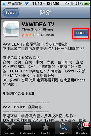 筆者很喜歡看壹電視,平時都是在吃飯時自己坐在電腦前看整點新聞,但有時候在外面想看壹電視時如果用Android手機的話可以直接用瀏覽器收視或是安裝「Skyfire」開啟壹電視網站一樣可以看,但如果改用iPhone時就沒這麼簡單了,雖然iPhone上也有「Skyfire」但是在台灣App Store下載不到,而且就算你用「其他方法」裝了Skyfire也常常莫名其妙的沒有反應(Android版是100%成功),為了這件事之前受邀到壹電視時我就有跟他家的CEO當面反應但也沒有下文,昨天剛好在壹電視主播夏家璐小姐FB抱怨後,竟然從夏主播那邊得知只要去App Store下載「VAWIDEA TV」就可以看壹電視,測試之後確實可行,趕快分享給大家。