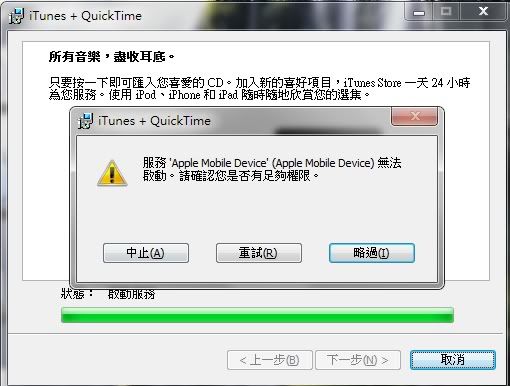 我的筆電是asus u30jc系統:windows 7家用進階版 64bit剛買iPhone4 要來安裝iTunes 發現以下問題:安裝蘋果網站所提供的 iTunes 10 64位元版首先出現以下畫面按下確定後繼續安裝,出現第二個錯誤畫面全部安裝完後,要執行iTunes出現此畫面不氣餒..全部重新反安裝後,改裝iTunes 9 結果還是一樣已經重複安裝不下數次了, 都不知道該怎麼解決..這樣我就不能使用iphone與我的電腦同步了還請各位高手大大幫助我,小弟感激不盡..謝謝!!