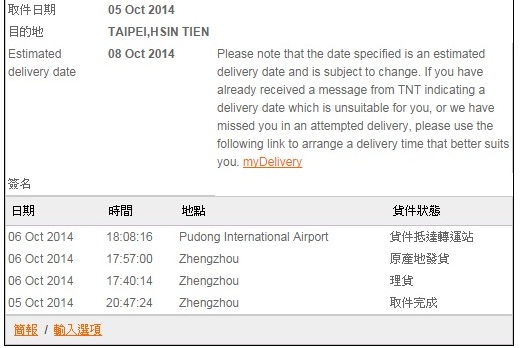 我發現有兩種不同狀況... 一種TNT已經進入理貨的狀態等飛機了...另一種就是還沒理貨的...經查詢...其分界點在你的提單號碼是160535059之前的...恭喜你..您是最後一個進入理貨狀態的而差三號的160535062的應該就是會收到APPLE通知延遲的信件的...希望只是人員還沒輸入...我們一樣可以10/8號收到貨...看來有困難了...(我是跟您一樣的)有個問題想請問那些提單號碼在160535059之前的..是不是沒有收到延遲通知呢?