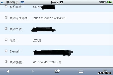 小弟有點白癡....印象中早上十點多有看到填寫資料畫面...結果送出後就當了...以為沒訂到.....中間一直狂按....到快二點送出才有回傳訊息: 這個門號已預約過...不能再預約....趕緊去查詢.....發現小弟在10:52分就已經預約成功..........結果我還一直按到下午...簡訊狂傳....