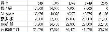 請教一下各位大大若是我買32g的話搭配1049方案:2年月租費1049*24=25176加上預繳及手機費25176+14900+12000=52076減去可抵扣52076-14400=37676搭配1349方案:2年月租費1349*24=32376加上預繳及手機費32376+7900+19000=59276減去可抵扣59276-22800=36476疑… 這樣算來2年總花費月租費1349的反而比月租費1049還低我記得之前有人整理出3gs的方案 算出來好像也是這樣兩者手機費加預繳都是26900其他還有什麼差別嗎? 不然當然是辦1349划算啊?!