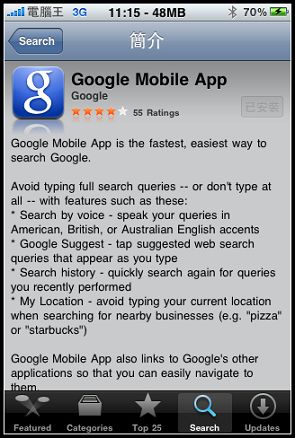 晚上得到老弟的線報(不知道有沒有LAG到)在APP STORE中的免費的Google官方軟體Google Mobile App,已經可以中文語音搜尋了!之前其實本來就可以語音搜尋,只是只能使用英文來搜尋,前陣子中文語音搜尋也剛在北京發表而已想不到Google這麼快就讓他上線,馬上介紹一下: