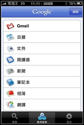 其實Google Mobile App是一套幾乎整合了Google現在所有的iPhone應用的軟體(我覺得大都是開啟網頁的捷徑),有Gmail、日曆、文件、相簿、翻譯....等等功能(我想最近最夯的Goggle應該也快上了),而Google導航我個人覺得APP STORE沒那麼好心會放行,所以有的等了: