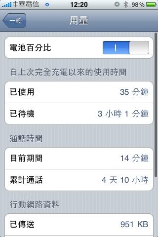 很多人說開 3G 沒問題但不知道是我去的地方 3G 太弱還是怎樣就算開著待機號電也是挺兇的這幾天發現一樣的設定和待機時間 (睡眠時)但是耗電量卻比以前大上很多一個小時可以掉約 5%之前是一晚上才 5%但是設定明明沒有去改變 今天試試重開機好了