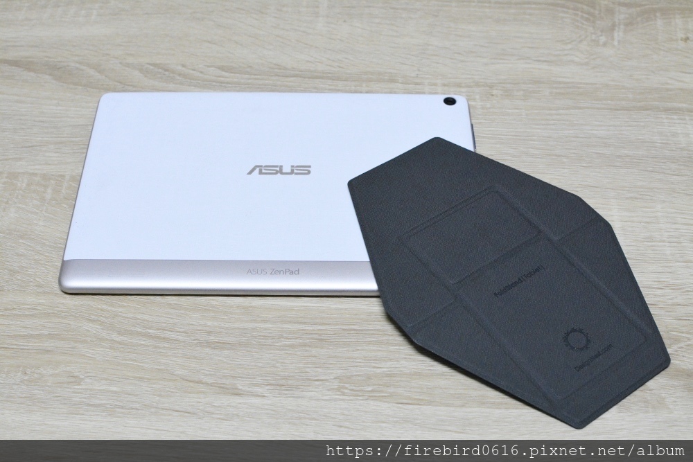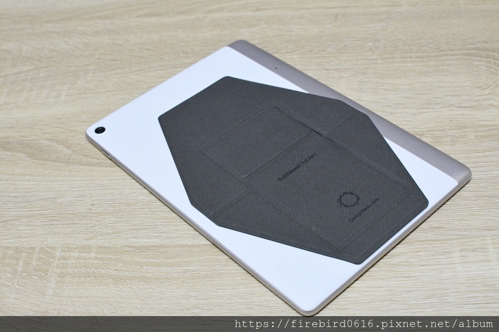配件中有個長方形磁鐵片,可以貼在平板的上方,收折起來時,上半部就會吸附在這磁鐵片上,不會搖來晃去的。