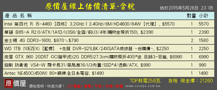 快問我是不是小白兔 wrote:主要用途:電繪、3D...(恕刪) 用原價屋系統組的,含正版win7Intel 第四代 R. I5-4460【四核】3.2GHz(↑3.4GHz)/6M/HD4600/84W【代理】, $5580Intel 1150腳位 22nm主機板 MB 微星 H97M-E35/M-ATX/1A1D1H/U3S6/全固/前U3/4年 (紅綠省100元), $2090Intel 1150/H97/含顯示埠記憶體 RAM 創見㊣ 8G DDR3-1600, $1650↘$1470桌上型記憶體 DDR3內接硬碟HDD|固態SSDSeagate 2TB (ST2000DM001) 64M/7200轉/三年保, $2750↘$25903.5" SATA3 硬碟燒錄器 CD/DVD/BD 先鋒 DVR-S21LBK/24XSATA燒錄器【紅綠配省20】, $499終極DVD燒錄器 SATA介面顯示卡VGA 微星 R7 250X 1GD5(1G DDR5)20.1cm(紅綠省160) *售完為止, $2990AMD R7-250X(PCI-E介面)CASE 機殼(+電源) 酷碼 殺手 102 顯卡長34/風扇高15.6/U3內置/SSD*2/ATX, $790Cooler Master 酷碼 (顯卡電源設計有側有後,內部空間僅供參考)電源供應器 酷碼 CM G450W 80+ 銅牌 / 單路12V.主動式PFC (RS450-ACAAB2-TW), $1490Cooler Master 酷碼系列作業系統OS|應用軟體 Windows 7 中文家用隨機 SP1 64位元 搭機價, $3450作業系統 Win7 隨機版TDP耗電276瓦 含稅 現金價:20949 紅綠配現省 280 現金優惠價:20669