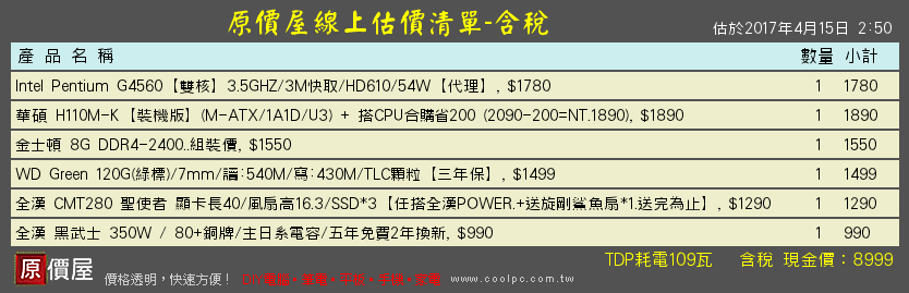 處理器 CPU Intel Pentium G4560【雙核】3.5GHZ/3M快取/HD610/54W【代理】, $1780 ◆ ★ 熱賣Intel Kaby Lake七代1151腳位 14nm11780主機板 MB 微星 H110M PRO-VD【裝機版】(M-ATX/1A1D/U3/四年保), $1890 ◆ ★ 熱賣 ↓任搭100↓Intel H110 / 1151 / DDR411890記憶體 RAM 美光 8G DDR4-2133, $1399 ◆ ★桌上型記憶體 DDR411399內接硬碟HDD|固態SSD 金士頓 HyperX FURY 120G/7mm/讀:500M/寫:500M/MLC顆粒【三年保】, $1599 ◆ ★2.5吋 SATA3 SSD 固態硬碟11599CASE 機殼(+電源) 杰強 小蜂魔 顯卡長34/風扇高14/SSD*1/M-ATX+Extreme 450電源【最後數量.售完為止】, $699 ★杰強 J-POWER (顯卡電源設計有側有後,內部空間僅供參考)1699TDP耗電109瓦 含稅 現金價:7367 任搭現省 100 現金優惠價:7267請參考~Iamwjc wrote:公司用文書機主要使...(恕刪)