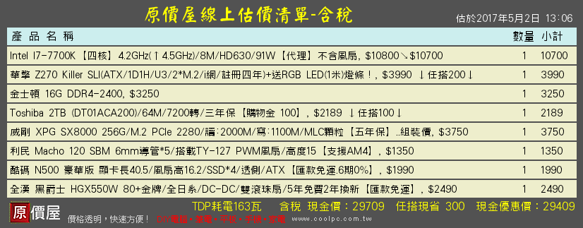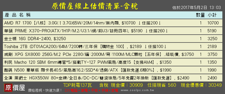 Q211010301 wrote:預算大概30k(可...(恕刪) i7 r7 各開一張給你參考如果你自己不太會拆拆裝裝升級東西或是改設定的話,組 r7 不至於有什麼問題我是覺得預算夠可以獨立一顆 SSD 放遊戲跟其他東西sata 裝置需求不大也可以考慮拿 b350 tomahawk 就好