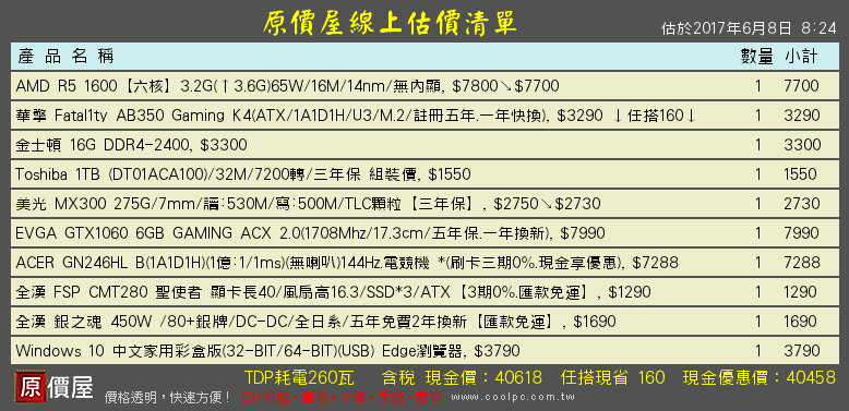 4萬可以調整一下直接上GTX1070囉 玩遊戲的話 4C8T 就夠了作業系統買 Play Asia 的 600 多而已勝這個預算就能上GTX1070X370 Killer 有五年保固+一年換新+到府收送