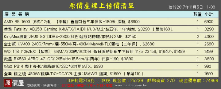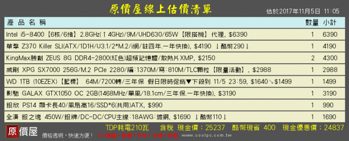 stacy華 wrote:預算約25k想請店...(恕刪) 25k 不含 OS, i5-8400, 8g, 1050ram 上 16g, SSD 拿 240g 以上的, 要 kingston 的話選 UV400可以考慮直接上特價的 SX7000, 保固比較長, 速度也比較快沒有一定要 i5 的話可以改組 r5 1600, 板子拿五年保的, 卡換 rx560