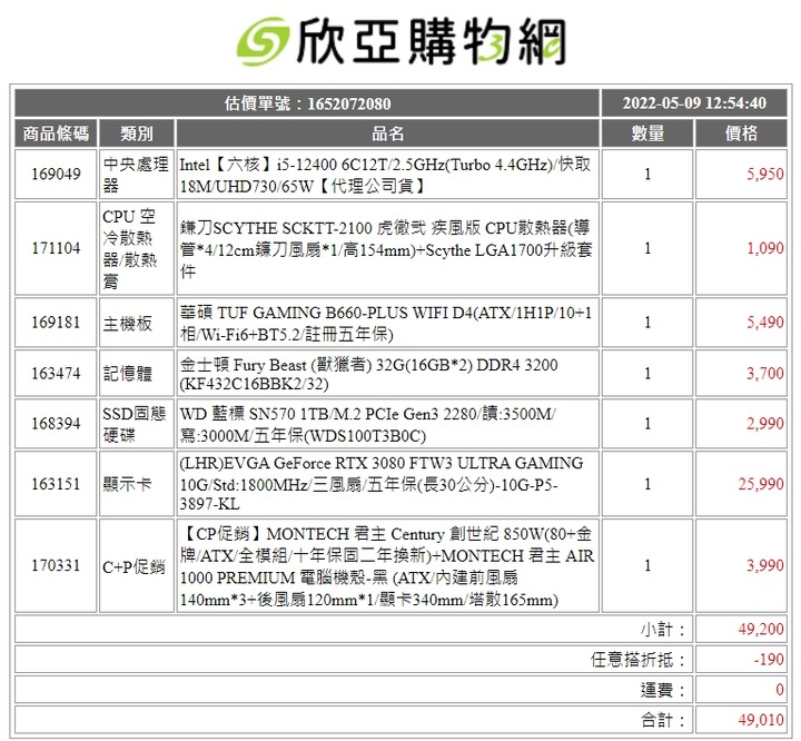 然後CPU我看評測,玩遊戲12400~12600非K根本沒差所以挑12400應該夠?