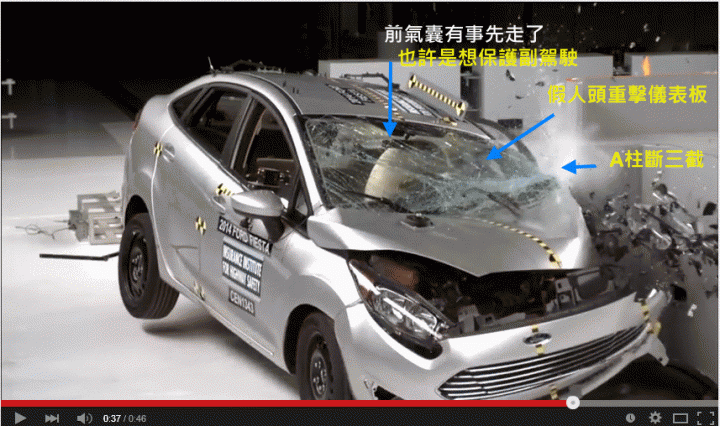 bambochen wrote:接下來我們再看看擁有六氣囊的Fiesta的表現如何...(恕刪) 這和KUGA一樣的情形, 撞擊後方向機整個歪斜, 氣囊根本接不到頭部, 頭部會向A柱方向撞擊過去! 這種致命的缺失原來Fiesta也有啊?