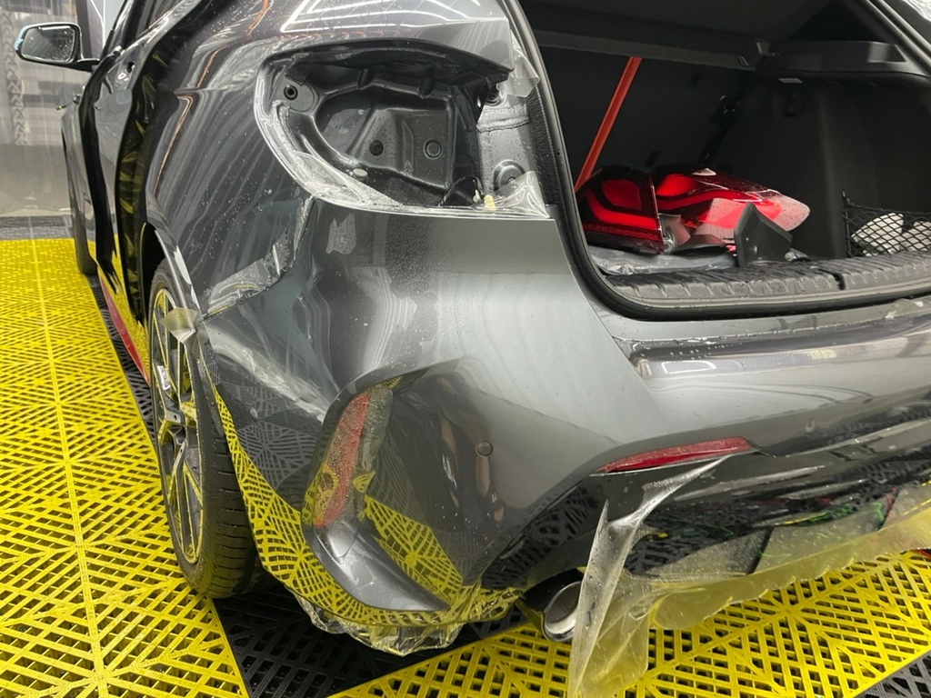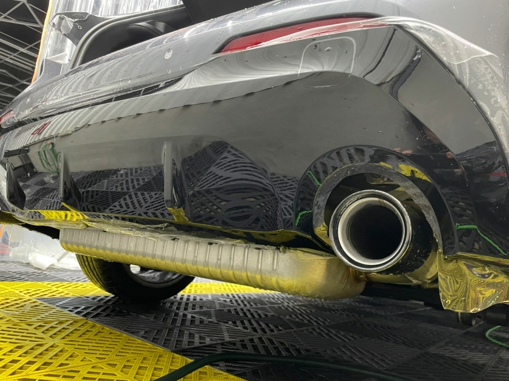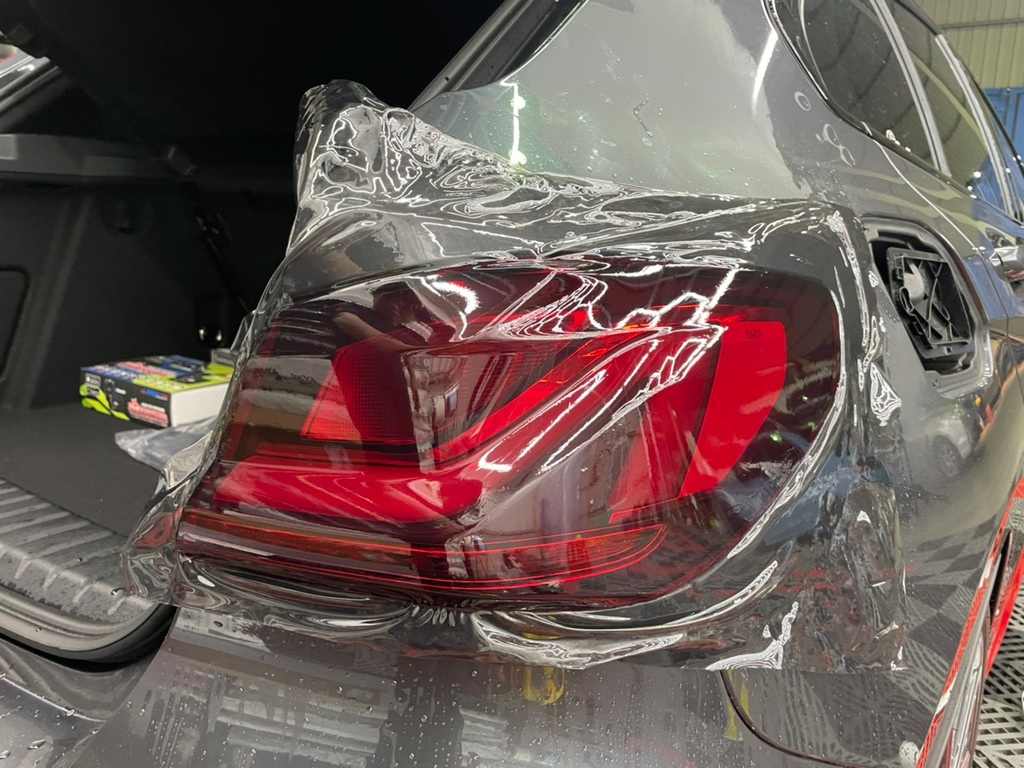 ▼老闆手工切割膜料以符合BMW 128ti雙排氣管設計