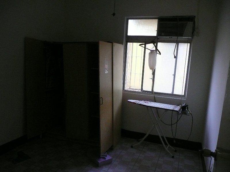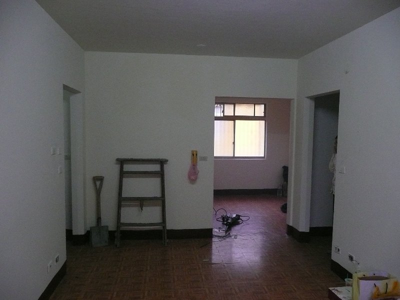 客廳,地板還是原來的塑膠地板,牆壁在不斷粉刷下,許多地方都凹凸不平,還有電燈開關,三個開關就分三個面板,真是......有點眼花撩亂,優點是,採用預鑄式工法,沒有樑,省了木工包樑的成本;不過缺點也是預鑄式工法,所以牆就等於是樑,都不能亂動、亂打~~