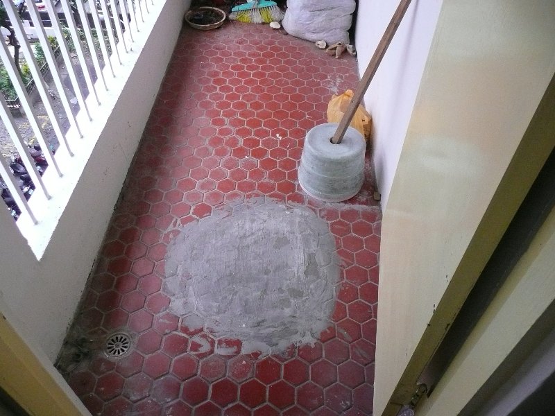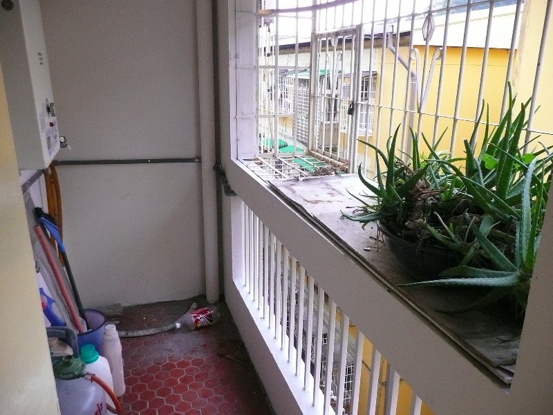 後陽台:在花格鋁上多加了一個水槽,方便洗衣服時刷刷領子或衣袖什麼的。熱水器和煮菜的爐都是用電的,原因請參照