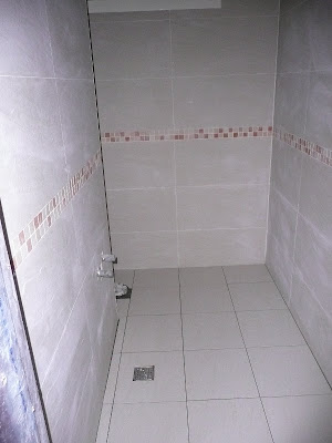 浴室廁所:這是小間廁所磁磚剛貼完後的照片,兩間貼的都是板岩磚,但是用不同色調做為區隔。小間是米黃色;大間是黑灰色。