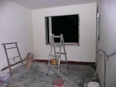客廳:景觀窗及三合一鋁門都已經裝上,油漆也將第一次漆上完,冷氣的洞也洗出來了,牆壁上的線路都已經就位,有點新屋的感覺囉~~