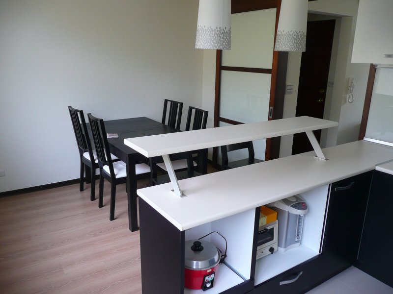 廚房、餐廳:因為是開放式廚房,餐廳與客廳之間裝了一道木門,避免油煙散到客廳。