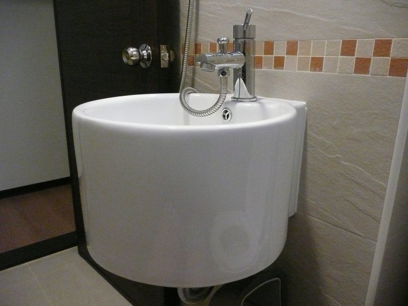 廁所:還是設置了蓮蓬頭,因應萬一有客人來住時的需求。面盆當初本來訂凱薩的,送來後才發現大了些,臨時上網找到萬華的一個店家有賣小尺寸的面盆,因為馬桶也是曲線造型,為搭配方便,選了一個蛋型的小面盆來裝。