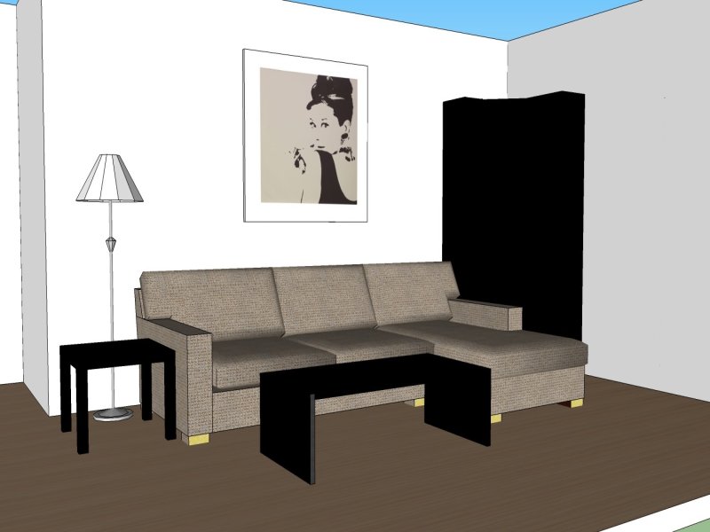 客廳:下圖是施工前使用Google SketchUp 7.0所繪製的客廳3D圖,把自己想要的家具擺置方式與位置先透過圖像呈現,比較不會在完工後才發現落差太大。