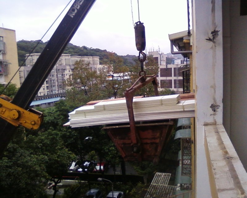 木作的材料吊進屋內囉,一直在旁邊擔心,很怕東西不小心掉到樓下說......
