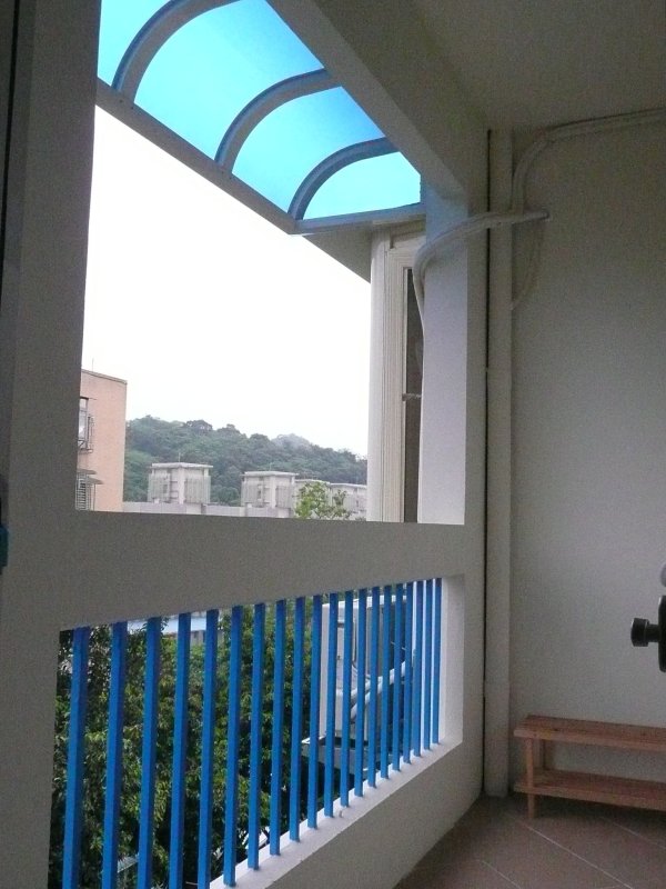 前陽台:我喜歡原來陽台的感覺,所以除了換地磚,油漆,加遮光罩以及把欄杆漆成藍色外,沒有多做其他裝飾(另一個原因是預算用盡啦........^^")。
