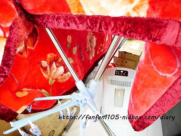 我就把除濕機放在毯子的下方,使用強力乾衣功能,讓毯子能更快速曬乾,也不會有濕悶潮溼的味道