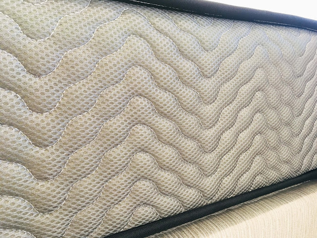店內有多種款式的床墊,透過視訊,服務人員引導我們到其中一張指定的「床墊奈奈」。拿下防塵套的床墊,看起來外觀典雅、做工細緻,有知名品牌的高質感。