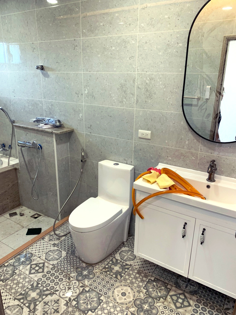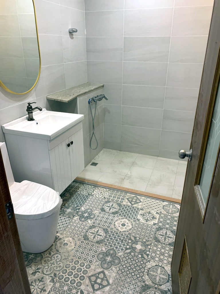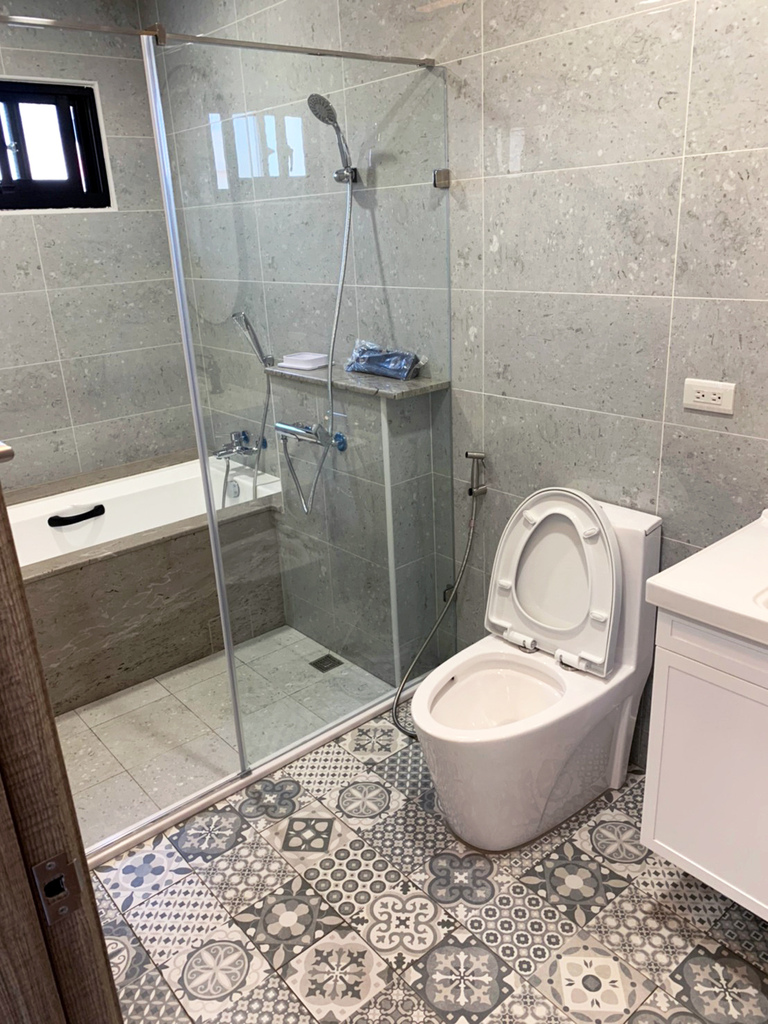 ▼廁所地板粉塵處理得很乾淨,廁所就是要這麼亮白潔淨用起來才舒服啊!花磚地板與白色洗手台、白陶瓷馬桶的對比真的好美,而且師傅完全沒有傷到漂亮的花磚
